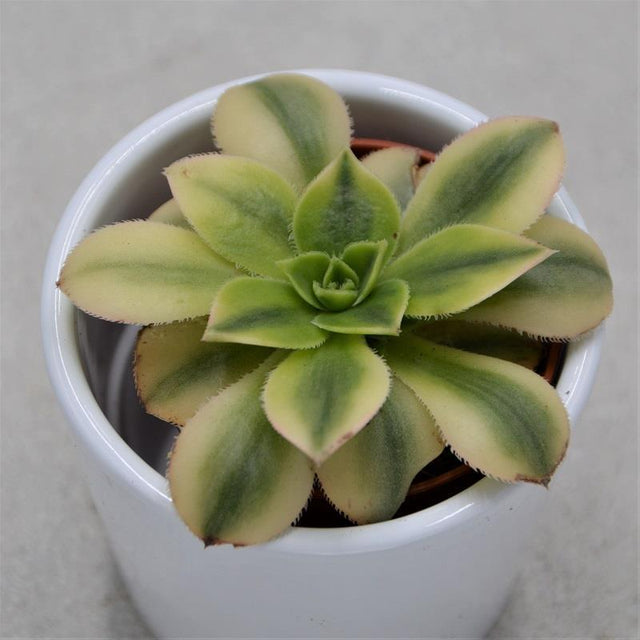 Aeonium decorum 'Sunburst' ist grün und gelb und hat die Wuchsform einer Rosette. Die Blüte ist weißt. Sie bildet sich innerhalb der Blütezeit im Sommer. Du erhältst eine Pflanze der Topfgröße 5,5cm, mit der Höhe mit Topf von ca. 7cm. Die erreichbare Wuchshöhe liegt bei 50cm.